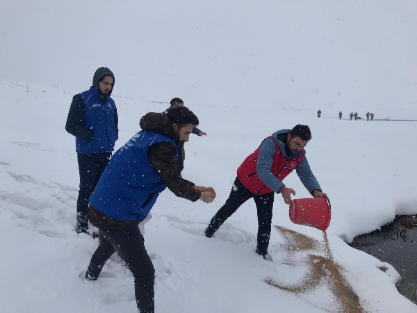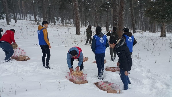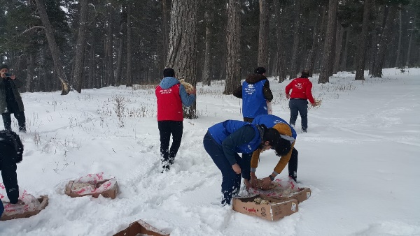KARS PUSULA / ADEM ALPArdahan'ın yüksek kesimlerinde kar kalınlığı bir metreyi bulunca, yiyecek bulmakta zorlanan yaban hayvanları için doğaya yem bırakıldı.Ardahanda birkaç günden beri etkili olan kar yağışı, hayatı olumsuz etkiledi. Kar kalınlığı, yüksek kesimlerde bir metreye ulaştı. Göle ilçesinde, kar yağışı nedeniyle yiyecek bulmakta zorlanan yaban hayvanları için Gençlik Merkezi, Doğa Koruma ve Milli Parklar Şubesi ile Orman Şefliği tarafından, ormanlık alan ve yüksek kesimlere yem bırakıldı. Bir metreye varan kar üstünde güçlükle yemleri taşıyan ekipler, 200 kilo tavuk ve 200 kilo buğdaydan oluşan yemleri belirlenen alanlara bıraktı.