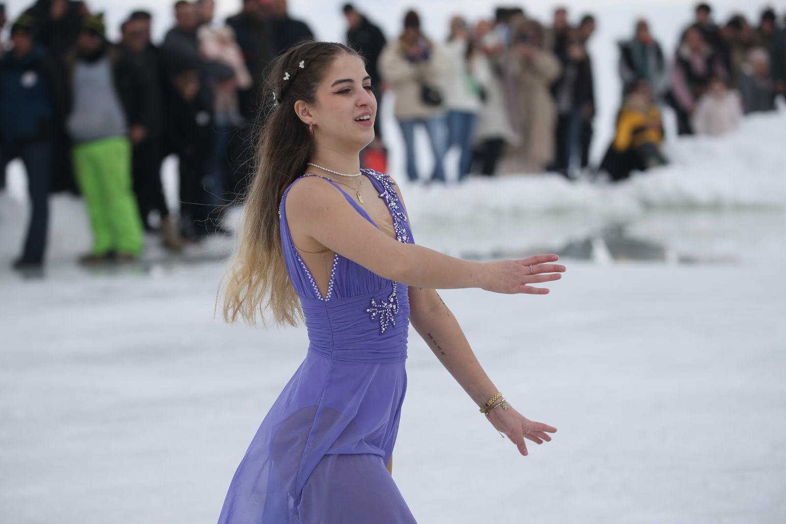 Artistik buz pateni sporcusu Yağmur Derin Kevinç, festivale vatandaşların yoğun ilgi gösterdiğini belirterek, “Bu kalabalığın önünde Çıldır Gölü’nde kaymak çok güzeldi. Çok mutluyum.” dedi.