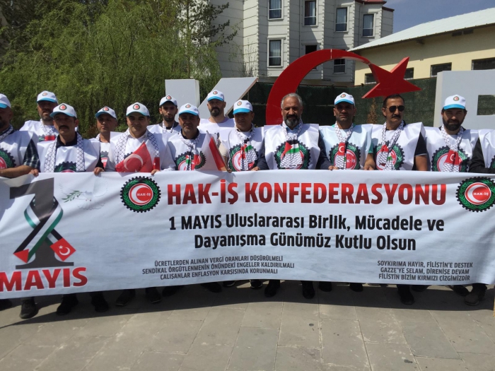 Katil İsrail’in zulmüne maruz kalan Filistin’li kardeşlerimize, işyerlerinde gece gündüz demeden alın teri döken vefakâr ve cefakâr emekçilerimize, birlikte yol yürüdüğümüz tüm kardeşlerimize Kocaeli Meydanından sesleniyoruz. Bugün buradayız, bugün 81 ildeyiz. Birlik, dayanışma ve mücadelemizi haykırmak için 81 ilde sizlerleyiz.Bugün 1 Mayıs Uluslararası Birlik, Mücadele ve Dayanışma Gününde;48 yıldır emeğimizin ve alın terimizin hakkı için, hayat pahalılığı ve yoksullukla mücadele edilmesi için, vergide adaletin sağlanması için ve sendikal örgütlülüğün artması için meydanlardayız.76 yıldır Siyonist İsrail’in Filistin topraklarında yaptığı katliamları, işgalleri, zulümleri tüm Dünya’ya haykırmak ve yaşanan zulümler sona ersin diye uluslararası topluma çağrıda bulunmak üzere alanlardayız.HAK-İŞ olarak, Siyonist İsrail’in ve katil Netenyahu’nun Uluslararası hukuk önünde en ağır şekilde cezalandırılmasını istiyoruz. Soykırıma karşı sessiz kalan Avrupa Birliği, ABD ve onun kuklalarını nefretle kınıyoruz, lanetliyoruz.Başta İslam İşbirliği teşkilatı olmak üzere, Arap Birliği ve pek çok sözde İslam ülkesini yeterli tepki ve destek vermedikleri için kınıyoruz. Yazıklar olsun onlara diyoruz.Uluslararası toplumu Filistin’de yaşanan zulme karşı harekete geçmeye davet ediyoruz.SLOGAN: FİLİSTİN’E DESTEK İNSANLIK BORCUMUZDUR.1 Mayıs Uluslararası Birlik, Mücadele ve Dayanışma Günü’nde HAK-İŞ olarak, Filistin topraklarında akan kanın ve katliamların durdurulması, Gazze’de onurları için, Özgür Filistin için, canları pahasına mücadele eden Filistinli kardeşlerimizin insan haklarının sağlanması için tüm dünyayı ve tüm dünya emekçilerini mücadele etmeye ve birlik olmaya davet ediyoruz.Siyonist İsrail Devleti tarafından esir alınan bütün Filistinli işçilerin serbest bırakılmasını talep ediyoruz.Başkenti Kudüs olan özgür ve bağımsız Filistin devleti kuruluncaya kadar mücadele edeceğimizi bir kez daha ilan ediyoruz.Filistin’de barış ve huzur ortamının sağlanmasını, Mescid-i Aksaya yönelik yapılan, en temel özgürlük olan ibadet özgürlüğünü hedef alan bütün kısıtlamaların ivedilikle kaldırılmasını talep ediyoruz.Filistin halkına, gıda, ilaç, su, gibi temel yaşam gereçlerinin güvenli ve insani koşullar altında ivedilikle ulaştırılmasını talep ediyoruz.HAK-İŞ, mazlum ve mağdur coğrafyalarda huzur ve barışın tesisi için sendikalarımız ve işçilerimiz ile omuz omuza dayanışmasını devam ettirecektir.“Filistin İçin Haydi HAK-İŞ” diyoruz ve tüm teşkilatımıza Kocaeli’den birlik, dayanışma ve yardımlaşma çağrısında bulunuyoruz.Değerli Emekçi Kardeşlerimiz,Bugün 1 Mayıs Uluslararası Birlik, Mücadele ve Dayanışma Gününde;- Vergide adaletin sağlanması,- Enflasyon, hayat pahalılığı ve yoksulluk ile mücadele edilmesi,- İş kazaları ve meslek hastalıklarının önlenmesi,- Kayıt dışı istihdamın ve sosyal güvencesizliğin önlenmesi,- İşsizlik, yoksulluk ve iş bulamama endişesinin olmadığı bir yaşamın sağlanması,- Emeklilerimizin asgari geçim şartlarının sağlanması,- Kadın, genç ve engellilerin çalışma ve toplumsal hayata katılımlarının desteklenmesi,Başta olmak üzere taleplerimizi tüm kamuoyuna duyuruyoruz.SLOGAN: EMEĞİN HAKKI İÇİN HAK-İŞ BURADA.HAK-İŞ, Türkiye ve Dünya Sendikal Hareketinde emeğin ve emekçinin bugünü ve geleceği içindurmaksızın çalışmaya devam edecektir.HAK-İŞ, ülkemizin, bölgemizin, küremizin bütün mağdur ve mazlumlarına olan borcunu ödemek için kararlılıkla mücadelesini sürdürecektir.Emeğin, emekçinin ve hak mücadelesinin gününde sosyal adalet, refah, güvenlik ve diyalog temelli taleplerimizi sıralıyoruz:Kıdem tazminatı hakkı korunarak yeni güvencelerle geliştirilmelidir.Emekli aylığı alt sınırının asgari ücret düzeyine yükseltilmesini talep ediyoruz.Belediye ve Belediye şirketleri dâhil bütün kamu çalışanlarının Kamu Çerçeve Protokolü’ne dâhil edildiği bir model talep ediyoruz.696 sayılı KHK Kapsamı dışında kalan işçilerin kadroya alınabilmesine imkân sağlayacak bir düzenlemenin yapılmasını, kadroya geçen işçilerin tayin, becayiş gibi özlük haklarının tam olarak verilmesini istiyoruz.6772 sayılı Kanun uyarınca Mahalli idarelerin iştiraklerinde veya şirketlerindeki işçiler için 52 günlük ilave tediyelerin ödenmesini istiyoruz.Sendikal örgütlenmenin önündeki engellerin kaldırılarak, toplu pazarlık kapsamının genişletilmesini, sendikal hak ve özgürlüklerin daha ileriye taşınmasını talep ediyoruz.ILO’nun C190 sayılı sözleşmesinin ülkemiz tarafından onaylanmasını istiyoruz.İşyerlerinde “Şiddete Sıfır Tolerans Belgesi” önerimizin imzalanmasını ve uygulanmasınıistiyoruz.Aile yükümlülüklerini dikkate alan, adil bir vergilendirme sistemi, sürdürülebilir bir sosyal güvenlik modeli ve vergi denetiminde etkinliğin artırılmasını talep ediyoruz.Kriz dönemlerinde gelir vergisi diliminin %10’a indirilmesini istiyoruz.Milli gelirden, ekonomik büyümeden ve refah artışından hak ettiğimiz payı almakistiyoruz.Emekçilerin enflasyona karşı ezdirilmemesini ve hayat pahalılığı ile yoksulluğa karşı korunmasını talep ediyoruz.İnsanı merkeze alan daha adil ve sürdürülebilir yeni bir model istiyoruz.Bireysel ve düzenli asgari gelir yardımı sisteminin kurularak, sosyal koruma sistemigüçlendirilmelidir.İş kazası ve meslek hastalıklarının yaşanmadığı bir çalışma hayatı talep ediyoruz.Sendikal örgütlülüğün artması için gerçek iş güvencesi istiyoruz.Kayıt dışı istihdamın ve çocuk işçiliğinin önlenmesini, işsizlik oranlarının düşürülmesini istiyoruz.Ekonomik ve Sosyal Konsey