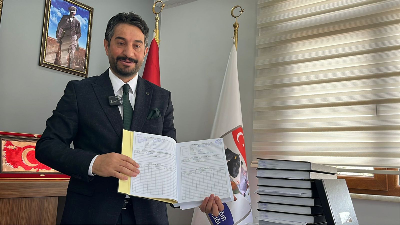 Arkadaşlar Şimdi ben damızlık Birliği'ni aldığımda hiçbir üyenin tek bir defter kaydı yoktu. Şimdi bakın burada noter huzuruyla bakın bütün üyelerimin tek tek defterler işte bu. Bakın. Hepsi kayıt altındadır. Üyeyi arttıran bizleriz, üyeyi katan biziz.