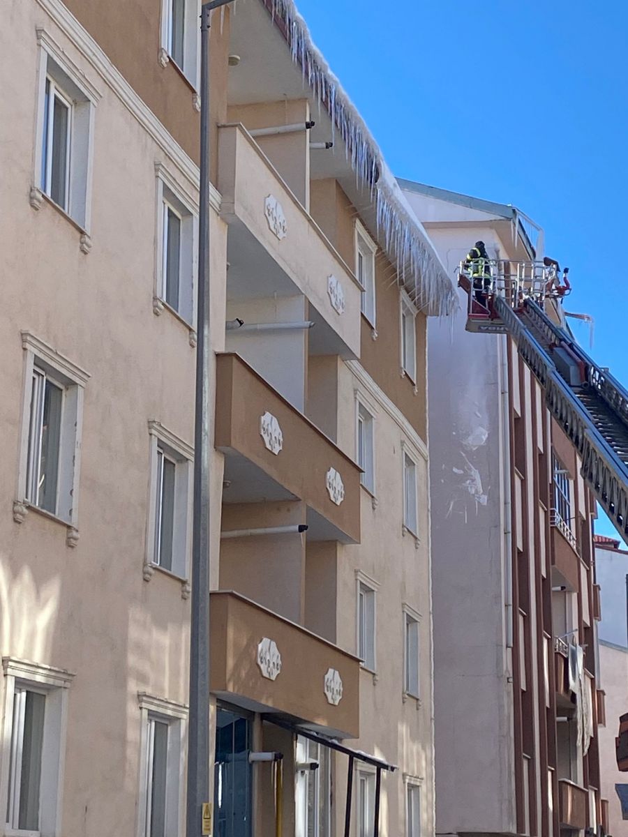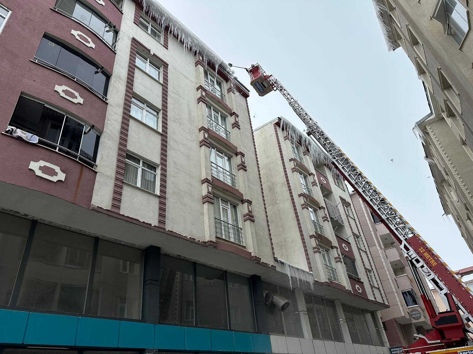 Kars Belediyesi İtfaiye Müdürlüğü ekipleri de buz sarkıtlarını kırmak için çalışma başlattı. İtfaiye aracının merdiveniyle bina çatılarına çıkan ekipler kürekle sarkıtları kırdı.