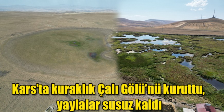 Kars’ta, kuraklıkla mücadele eden çalı gölü ve su göletleri havadan drone ile görüntülendi. Kars’ta kuraklık Çalı Gölü’nü kuruttu, yaylalar susuz kaldı.