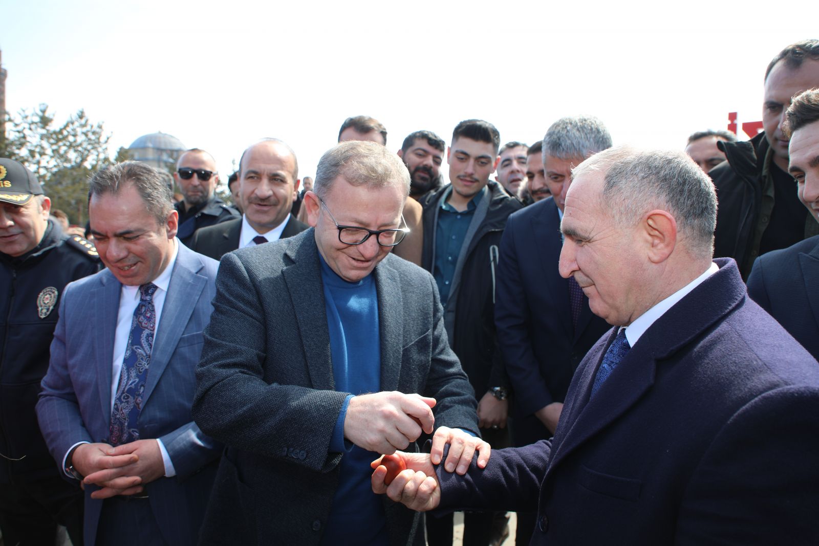 Programda öğrenciler tarafından halat çekme yarışması düzenlenirken, protokol üyeleri de bayram geleneği gereği yumurta tokuşturdu.