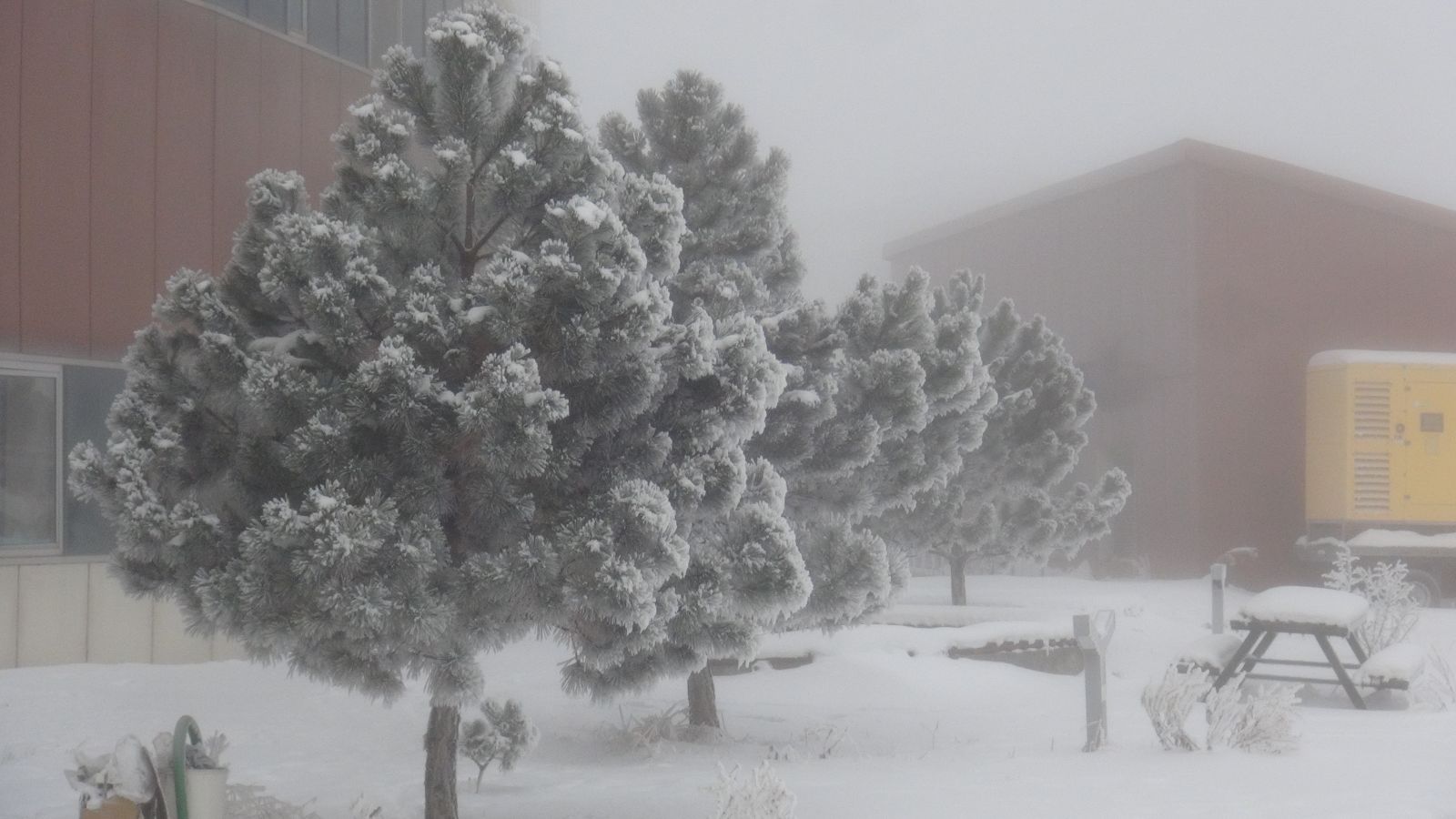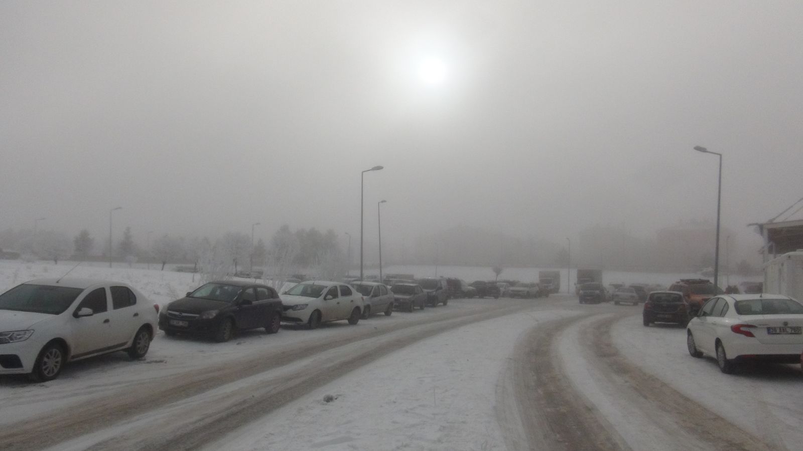 Kars’ta soğuk hava nedeniyle ağaçlar kırağı tuttu, karayolunda sis meydana geldi.