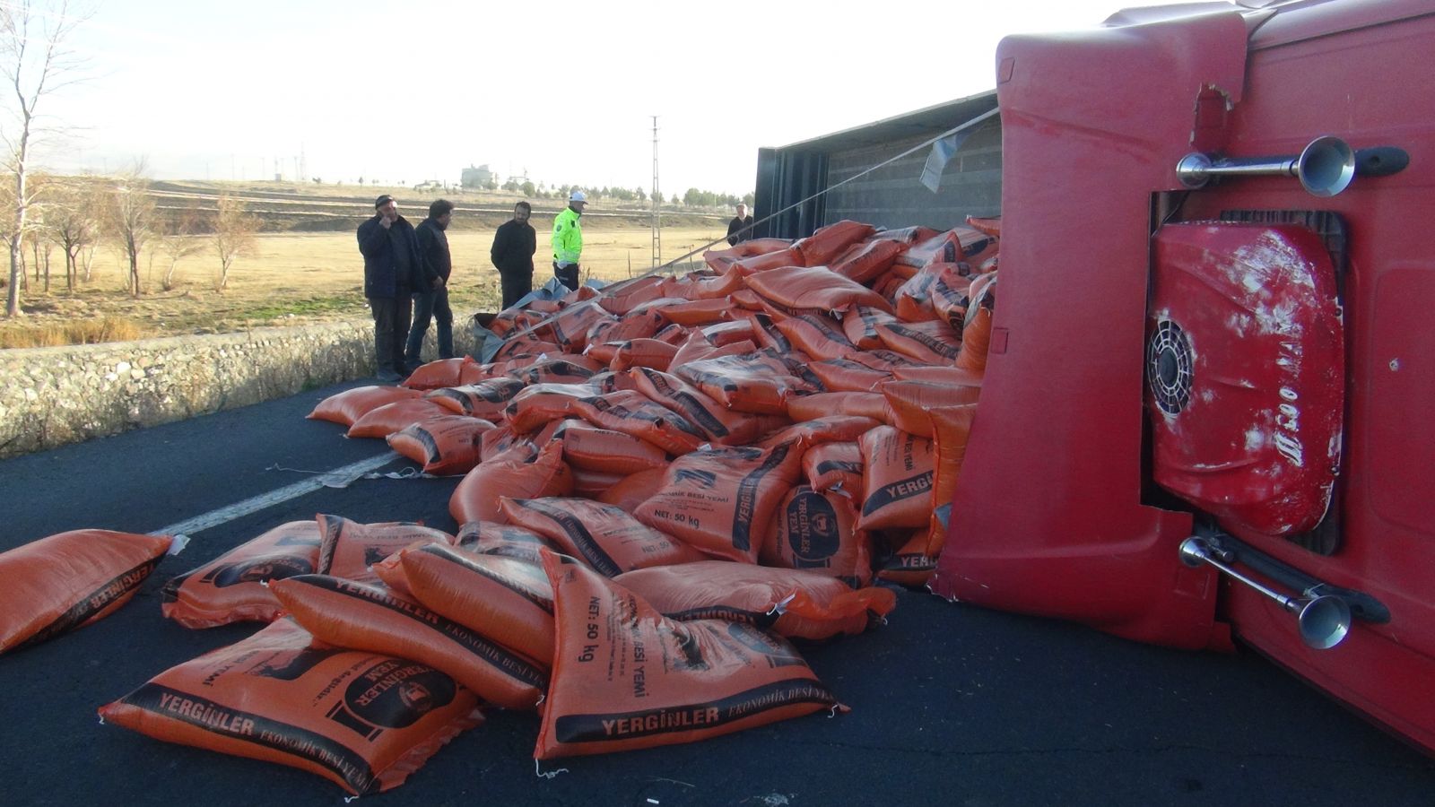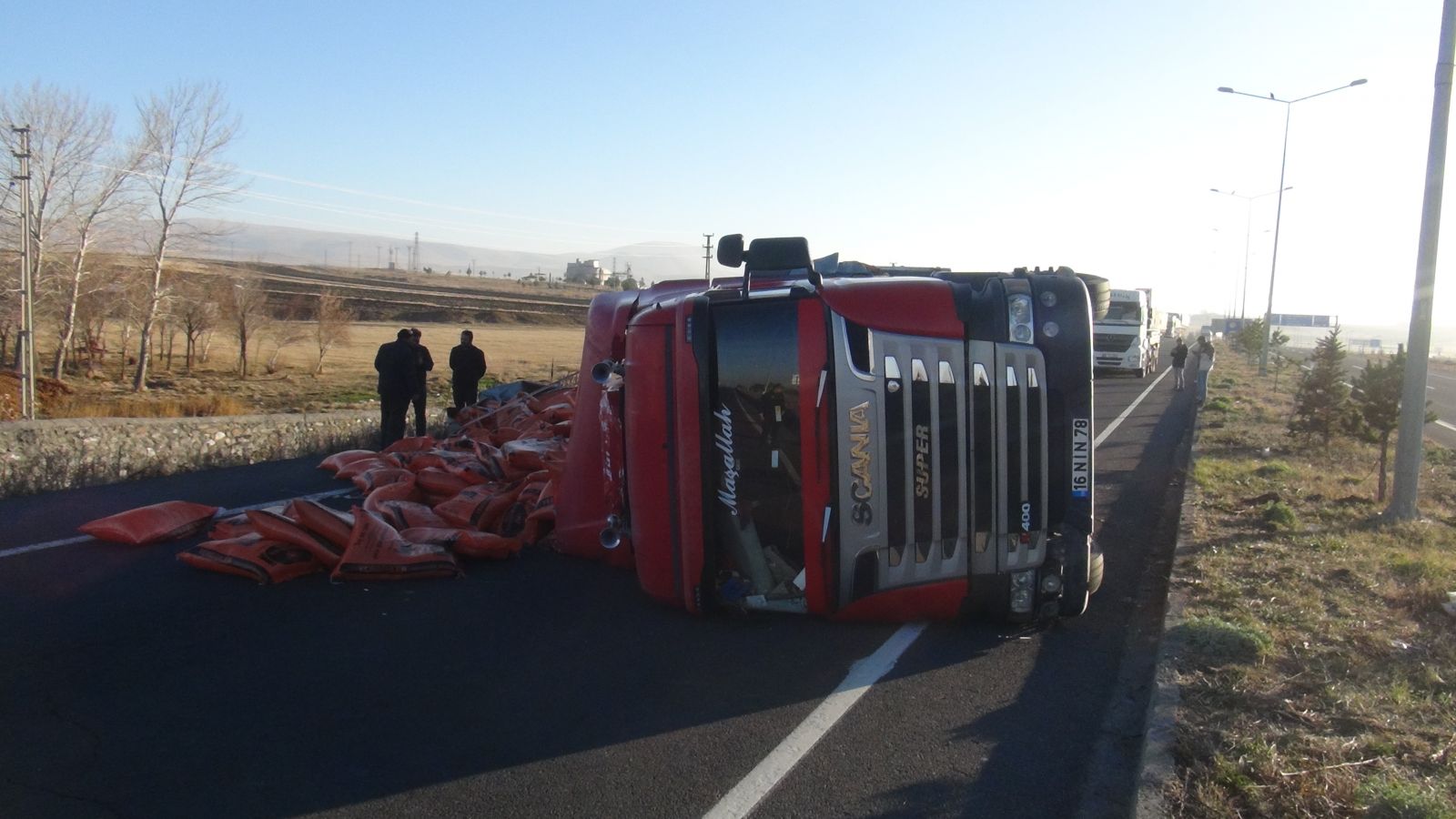 Hayvan yemi yüklü 16 NIN 78 plakalı tır, sürücüsünün direksiyon hakimiyetini kaybetmesi sonucu devrildi. Kazanın ardından olay yerine sağlık, itfaiye ve polis ekipleri sevk edildi.