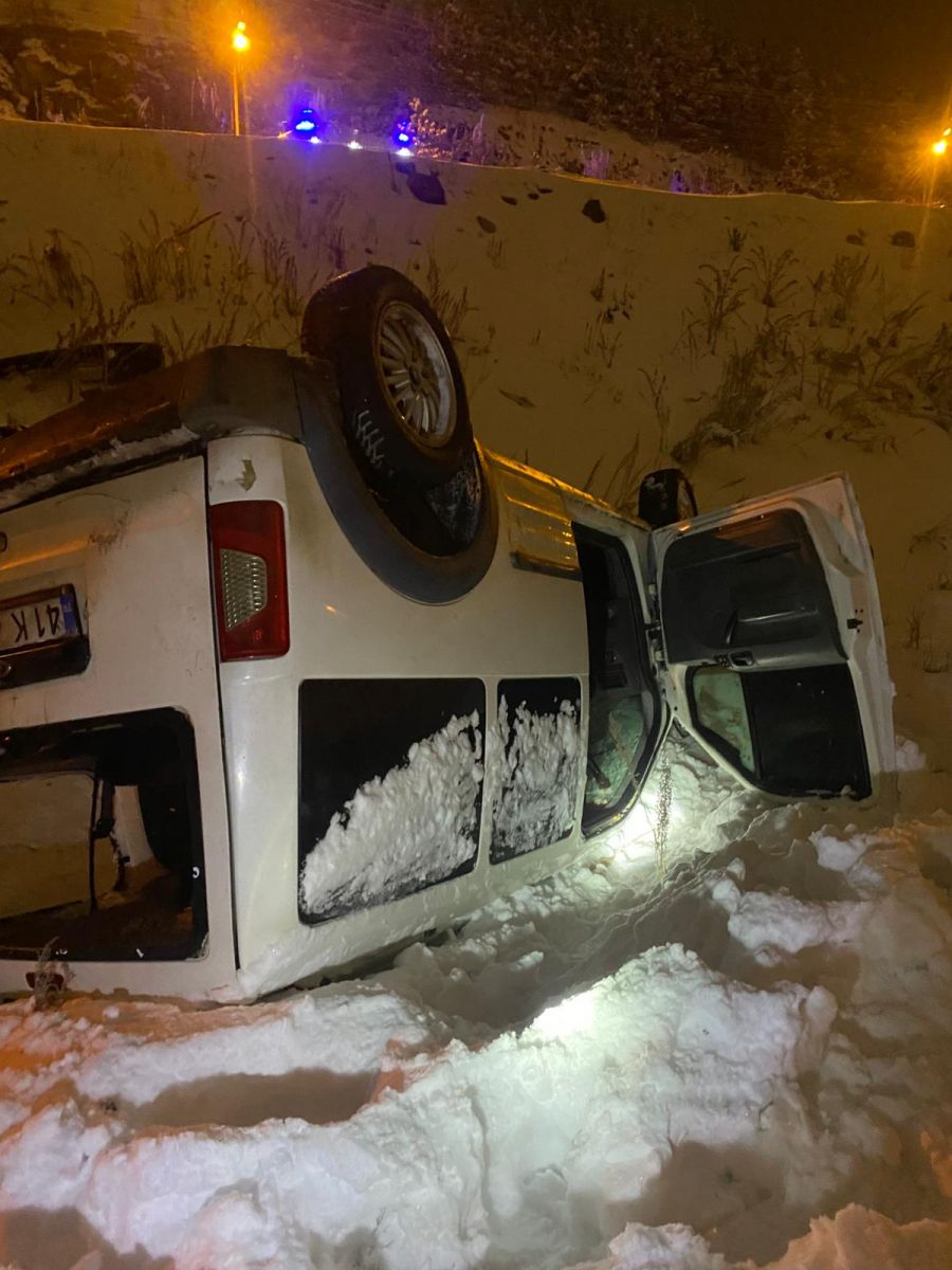 Kars'ta kar yağışı sonrası buz pistine dönen yolda kontrolden çıkan hafif ticari araç, takla atarak şarampole devrildi. Araçta sıkışan biri kadın 2 kişi, itfaiye ekiplerinin zamanla yarıştığı çalışmasıyla kurtarılarak hastaneye kaldırıldı.