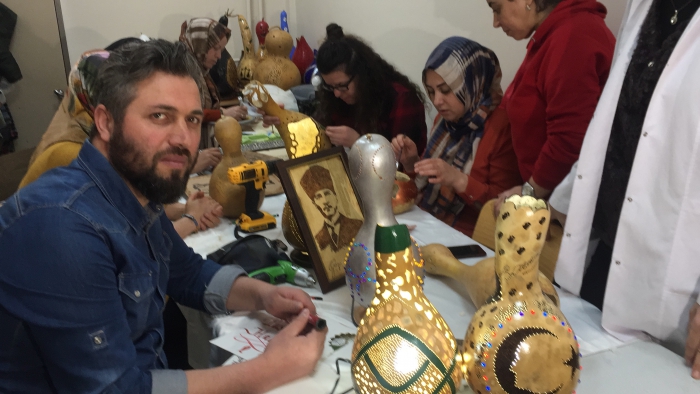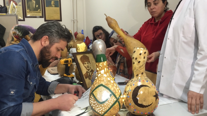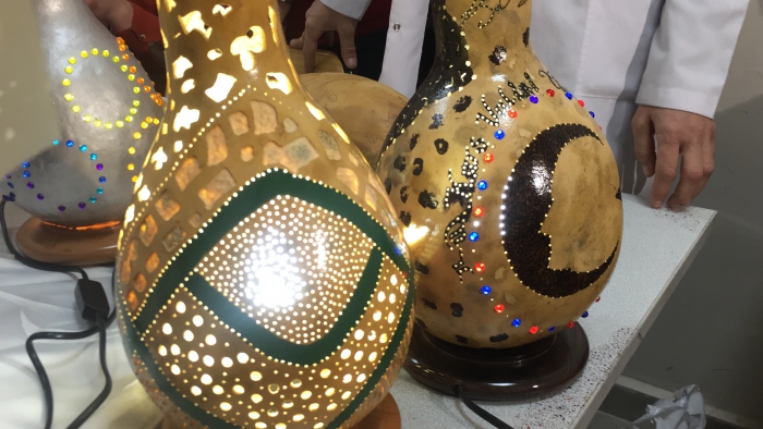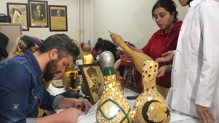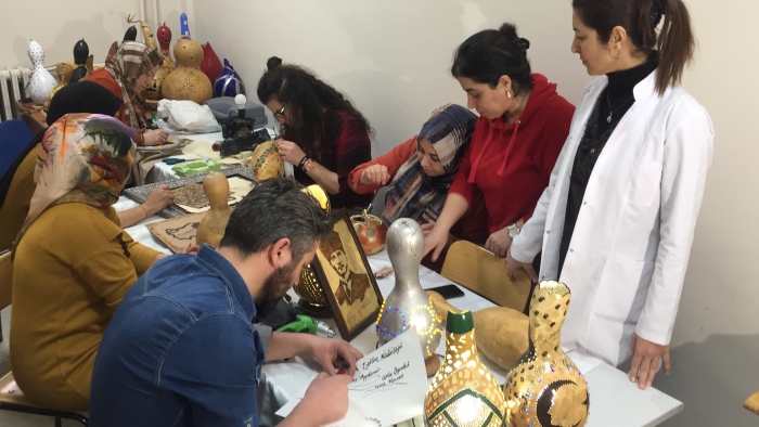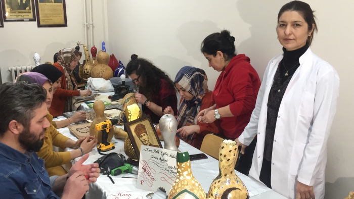 Kars'ta Halk Eğitim Merkezi Müdürlüğü tarafından açılan kursa katılan kadınlar, su kabağından ürettikleri gece lambası, abajur, avize, vazo gibi çeşitli dekoratif ürünleri sergilerde satarak aile bütçelerine katkıda bulunuyor. Milli Eğitim Bakanlığı Hayat Boyu Öğrenme Genel Müdürlüğü öncülüğünde, İl Kültür ve Turizm Müdürlüğü ile Halk Eğitim Merkezi Müdürlüğünün işbirliğinde kentte su kabağı işlemeciliği kursu açıldı. Kurs eğitmeni Evrim Aydemir Su Kabağından farklı dekoratif ürünler ürettiklerini belirtti. Aydemir; "Su kabağı ham haliyle geliyor ve kurutuluyor. İçinin temizliği yapılıyor ve tohumları alınıyor. Daha sonra şekil vermeye başlıyoruz. Su kabaklarını sanat eserine dönüştürüyoruz, daha sonra da satışa sunuyoruz. Kadınlar elde ettikleri gelirle de aile bütçelerine katkı sağlıyor. Su kabağının hazırlanması 2 gün sürüyor, temizliği yapılıp oyma işlemiyle devam ediyoruz. Daha sonra desen çizimi yapılıp süsleri takılıyor. Satış ilgi görüyor, soranlar çok oluyor ve görseli çok dikkat çekiyor.Su Kabağı kursuna katılan Canan Ulucutsoy da boş durmamak ve bir uğraş içinde olmak için kursa geldiğini ifade etti. Su kabağı çalışmalarının eğlenceli olduğundan bahseden Ulucutsoy, "Su kabağı işlemeciliği yanında yakma sanatını ve diğer el sanatlarını da öğreniyoruz." Dedi.