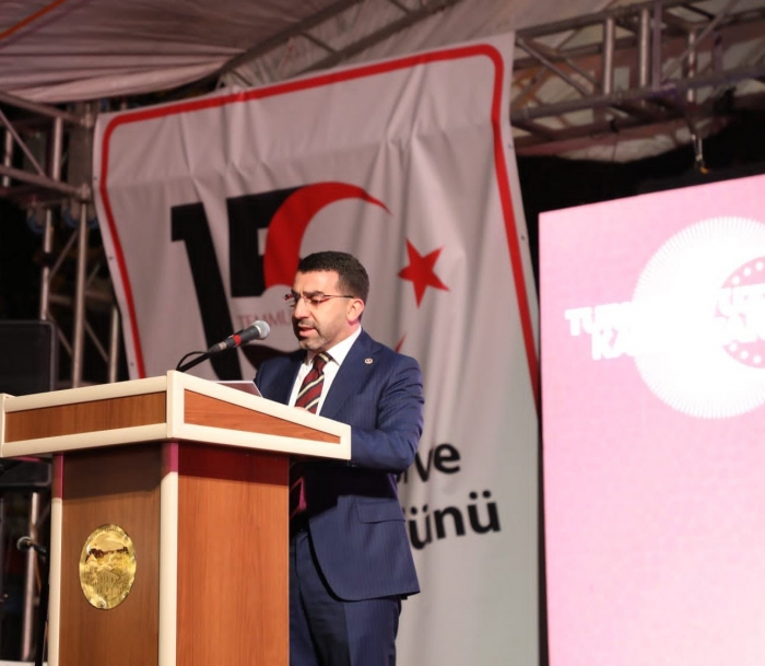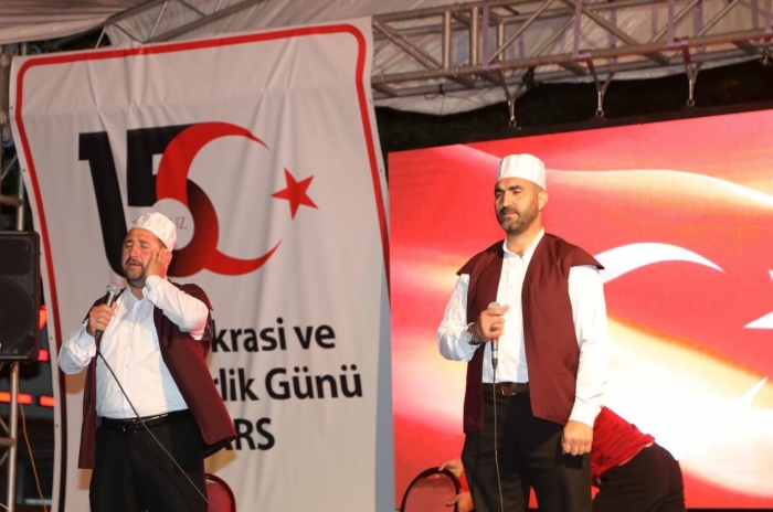 Kars’ta 15 Temmuz hain darbe girişimin 7’nci yıl dönümünde yüzlerce Karslı bayraklarla demokrasi meydanını koştu.Kars Kalesi Bedesten Bölgesi’nde araç kortejinin ardından kortej yürüyüşüyle başlayan etkinlikte ellerinde bayraklarla yürüyen yüzlerce vatandaş demokrasi meydanında düzenlenen programa katıldı.15 Temmuz Milli Birlik ve Demokrasi Günü etkinlikleri saygı duruşu ve İstiklal Marşı’nın okunmasıyla başladı. Kur'an-ı Kerim tilavetinin ardından kalabalığa seslenen AK Parti Kars Milletvekili Adem Çalkın, “15 Temmuz 2016 günü darbe girişimiyle karşı karşıya kalan ülkemiz, milleti ve devletiyle omuz omuza verdiği direniş mücadelesiyle tüm dünyaya örnek teşkil etmiştir. Türk demokrasisini hedef alan bu hain girişim aziz milletimizin demokrasiyi ve seçilmiş iradeyi korumak için gösterdiği destansı direnişle geri püskürtülmüştür” dedi.Kars Valisi/Belediye Başkan Vekili Türker Öksüz ise, “Bu aziz topraklardaki bin yıllık varlığımıza karşı 15 Temmuz 2016 gecesi yaşanan hain darbe girişimi, Cumhurbaşkanımız Recep Tayyip Erdoğan'ın liderliğinde, aziz milletimizin onurlu direnişi ile bozguna uğratılmıştır. Milletimiz dünyada eşi görülmemiş bir cesaret ile tek millet, tek bayrak, tek vatan, tek devlet şiarıyla Fetullahçı Terör Örgütüne karşı büyük bir demokrasi zaferine imza atmış ve Türkiye'nin gücünü dünyaya bir kez daha göstermiştir. Fetullahçı Terör Örgütü tarafından 15 Temmuz 2016 günü kalkışılan hain darbe girişiminde tarihin her döneminde olduğu gibi tarafını devletinden, milletinden, demokrasiden yana seçen, tarihi kahramanlıklarla dolu siz aziz Karslı hemşehrilerimi en kalbi duygularımla selamlıyorum” diye konuştu.Konuşmaların ardından aşıklar şiirler okudu, 15 Temmuz sinevizyon gösterisi ile devam eden etkinlikler gece demokrasi nöbetiyle son bulacak.Düzenlenen etkinliklere, Vali ve Belediye Başkan Vekili Türker Öksüz, 14’üncü Mekanize Piyade Tugay Komutanı Tuğgeneral Hakan Tunç, AK Parti Kars Milletvekili Adem Çalkın, Cumhuriyet Başsavcısı Abdullah Amanvermez, daire amirleri, siyasi parti ve sivil toplum kuruluşları temsilcileri, şehit ve gazi yakınları, askeri erkan ve vatandaşlar katıldı.