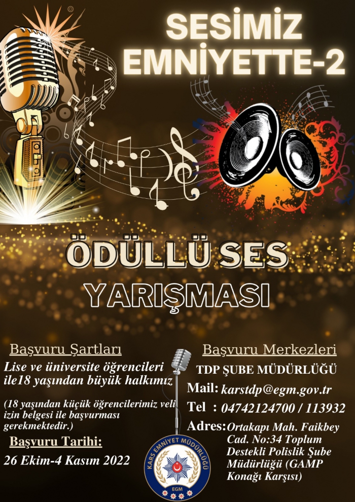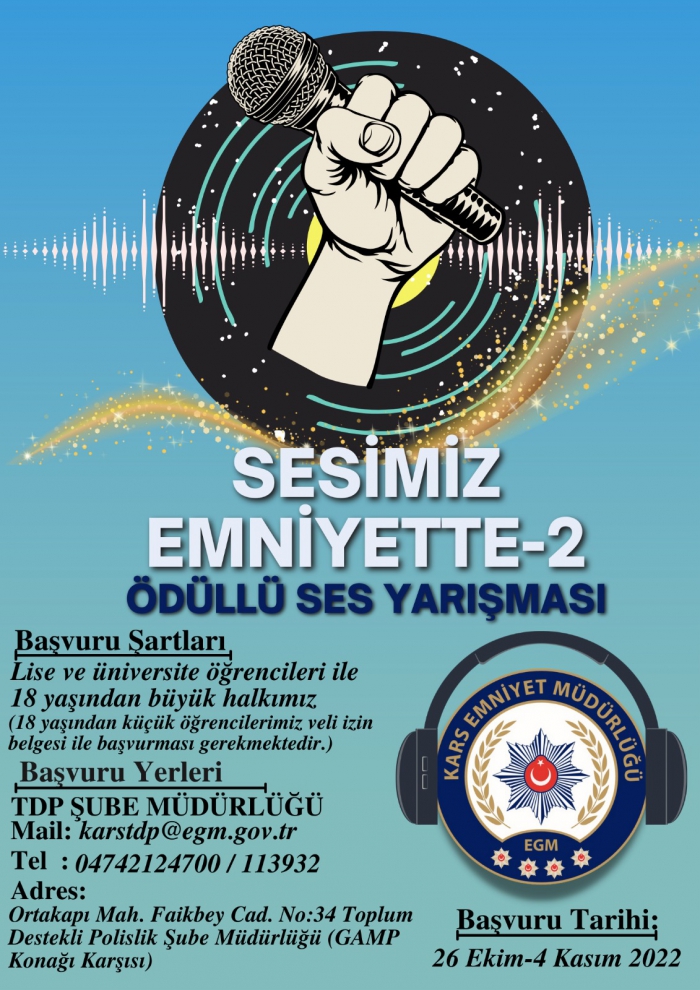 Kars İl Emniyet Müdürlüğü, bu yıl ikincisini düzenleyeceği “Sesimiz Emniyette-2” ses yarışması için başvurular devam ettiğini duyurdu. İl Emniyet Müdürlüğü Toplum Destekli Şube Müdürlüğü tarafından yürütülen “Sesimiz Emniyette-2” ödüllü ses yarışması için başvuru süresinin devam ettiği ve başvuruların 11 Kasım 2022 tarihinde sona ereceği bildirildi. “Sesimiz Emniyette-2” ses yarışması için başvuruyu, lise ve üniversite öğrencileri (18 yaşından küçük olanlar veli izin belgesi ile başvuru yapabilecek) ile 18 yaşından büyük tüm vatandaşlarımız; öğrenci olma şartı yok, esnaf, 40 yaşında bir vatandaş başvuru yapabilir denildi.İl Emniyet Müdürlüğünden yapılan duyuruda; "“Sesimiz Emniyette-2” ödüllü yarışmaya katılmak isteyen vatandaşlarımız başvurularını 11 Kasım 2022 tarihine kadar İl Emniyet Müdürlüğü Toplum Destekli Şube Müdürlüğüne yapabilirler denildi."