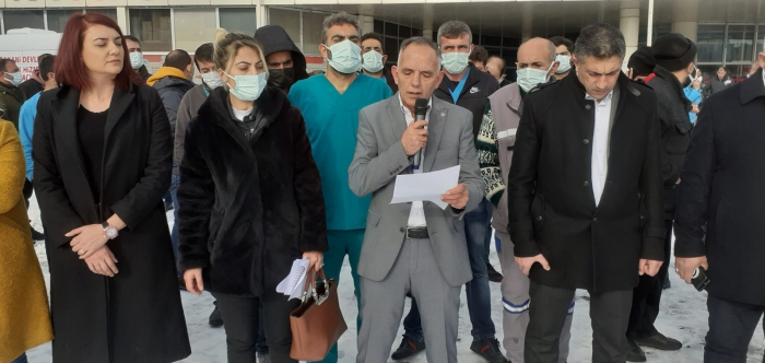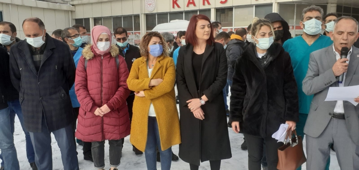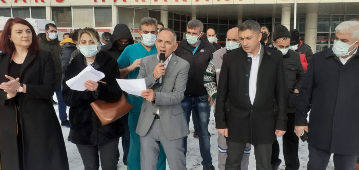 Öz Sağlık İş Sendikası Kars Şube İl Başkanı Adnan Yerli, burada grup adına yaptığı açıklamada, Hepinizin yakından bildiği gibi kamuoyunda “Hekim Zammı” olarak adlandırılan çalışma, diğer tüm sağlık çalışanlarının tepkisi ile karşılaşılınca isabetli bir karar ile yeniden değerlendirilmek üzere bütçe görüşmelerinden sonraya bırakılmıştır. “Pandeminin kahramanı sağlık çalışanlarına müjdemiz var” denilerek açıklanan zam haberi ile kimlerin sağlık çalışanı olarak görülüp, kimlerin kapsam dışı tutulduğu net olarak ortaya çıkmıştır. Yapılan açıklamalarla, “Sağlık İşçisinin”, “Sağlık Çalışanı” olarak görülmemiş olması bizleri derinden üzmüştür. Hekimlere yapılacağı ilan edilen ve biz sağlık işçilerinin de desteklediği zamlarla ilgili kimsenin bir sıkıntısı yoktur dedi.