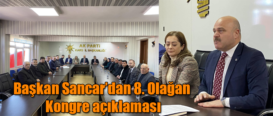 Ak Parti Kars İl Başkanı Muammer Sancar 8. Olağan Büyük Kongre ile ilgili düzenlediği basın toplantısında; "İktidara geldiğimiz ilk günden bu yana tek hedefimiz; daha güçlü, daha müreffeh, daha özgürlükçü ve daha demokratik bir Türkiye inşa etmek olmuştur" dedi.İl Başkanı Sancar; "8. Olağan Kongremiz için gün sayıyoruz. Bu süreçte il ve ilçe kongrelerimizi büyük bir coşku, heyecan ve disiplin içerisinde tamamladığımızın özellikle altını çizmek istiyoruz. Şükürler olsun ki, gerçekleşen kongreler vesilesiyle bir kez daha teşkilatlarımızda olağanüstü bir birlik ve beraberliğin hakim olduğuna şahit olduk. Hizmetin önüne koyulacak her türlü engel ve zorluğa göğüs gerecek iradeye sahip olan yol arkadaşlarımızın dayanışmasını, azim ve kararlılığını gördük. Zira bizi her daim güçlü kılan ve diğer siyasi partilerden ayrıştıran en önemli farkımız da hiç kuşkusuz bu hasletlerimizdir. Memleketimizin 81 ilinde Cumhurbaşkanımız, Genel Başkanımız Recep Tayyip Erdoğan''ın liderliğinde ''halka hizmet, hakka hizmettir'' şiarıyla gece gündüz demeden fedakarca çalışan teşkilatlarımızla büyük, güçlü bir aile olmanın haklı sevincini ve gururunu yaşıyoruz. Partimiz, değişim ve yenilenme sürecini köklü tecrübesiyle harmanlayarak bugünlere gelmiştir. Her yeniliği, birikimle besleyip milletimize gönülden hizmet edecek kadrolar yetiştirmiştir. İşte bu nedenle, bizim anlayışımızda kadrolar arasında ''eski'' ya da ''yeni'' ayrımı yoktur; bizde sadece davamıza hizmet eden güçlü bir ekip ruhu ve adanmışlık vardır. Kongre çalışmalarımızın başladığı andan itibaren de ilçe başkanlıklarında yüzde 65, il başkanlıklarında ise yüzde 75 oranında bir değişim gerçekleştirdik. Bu değişim, hiç kuşkusuz partimize yeni kan, can ve heyecan katacaktır. Cumhurbaşkanımız, Genel Başkanımız Recep Tayyip Erdoğan''ın da dediği gibi ''Kongremiz, yeni bir atılımın miladı olacaktır."