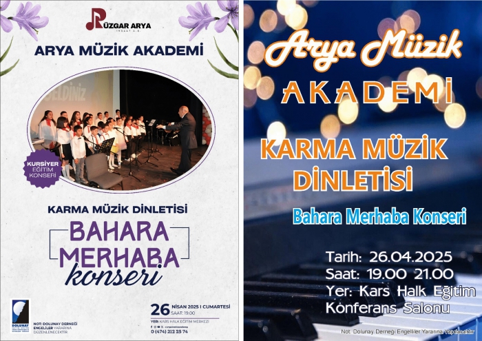 Arya Müzik Akademi bu yılda engelliler yararına konser düzenliyor. Kars Arya Müzik Akademi kurulduğu yıldan itibaren engelliler yararına her yıl konser düzenliyor. Konserin geliri Dolunay Derneği’ne bağışlanıyor.