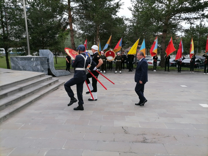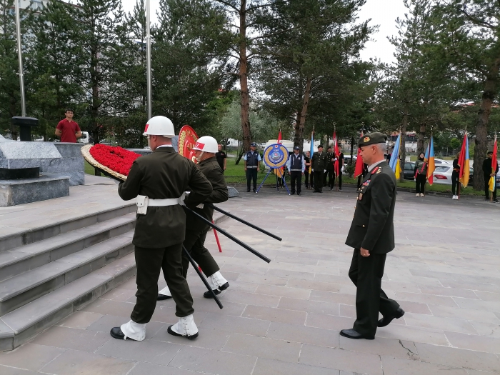 Kars Valiliği önünde bulunan Atatürk anıtına Vali Ziya Polat, 14’ncü Mekanize Piyade Tugay Komutanı Tuğgeneral Şahin Yenilmez ve Belediye Başkanı Ötüken Senger tarafından çelenk konulduktan sonra saygı duruşunda bulunuldu ve İstiklal Marşı okundu. Ardından Kars şehitliğini ziyaret eden protokol üyeleri, şehitlerimize dua ederek, şehit kabirlerine karanfiller bıraktılar. Şehitlerin mezarları başında dua eden il protokolü şehit ailelerine de baş sağlığı diledi.